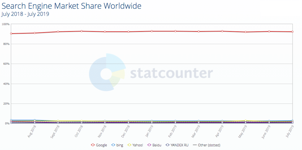 人们越来越担心谷歌多年来获得的权力。事实上,谷歌拥有近90%的搜索市场份额: