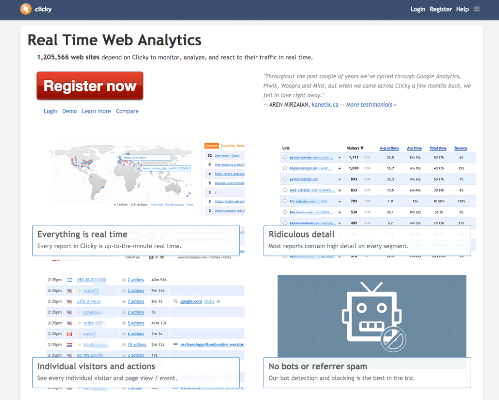 Clicky提供的分析软件不仅可以跟踪关键指标,还可以让您查看访问者的行为、使用热图、监控正常运行时间等。