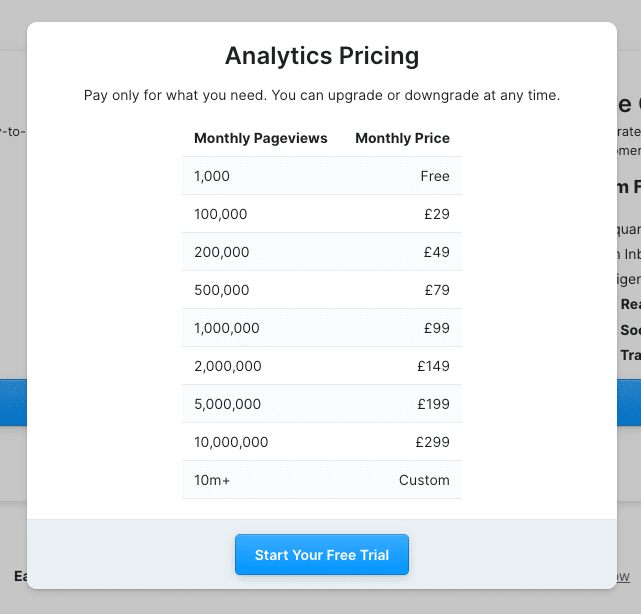 例如,使用Analytics产品时,如果您的网站获得超过1,000次网页浏览量,您将需要支付29英镑/月(24美元/月):