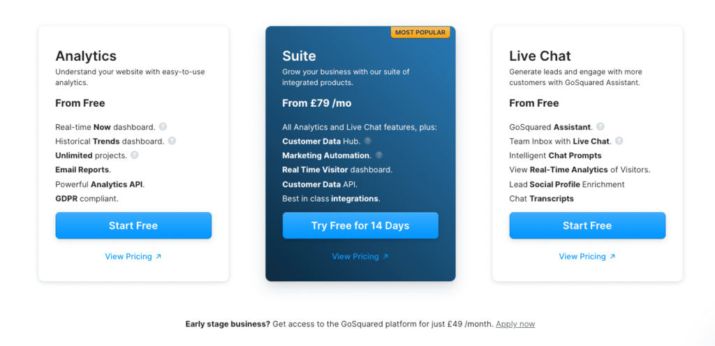 您可以开始免费使用GoSquared的分析软件,然后随着流量的增长进行升级。相反,如果您选择套件,价格从79英镑/月(96美元/月)开始: