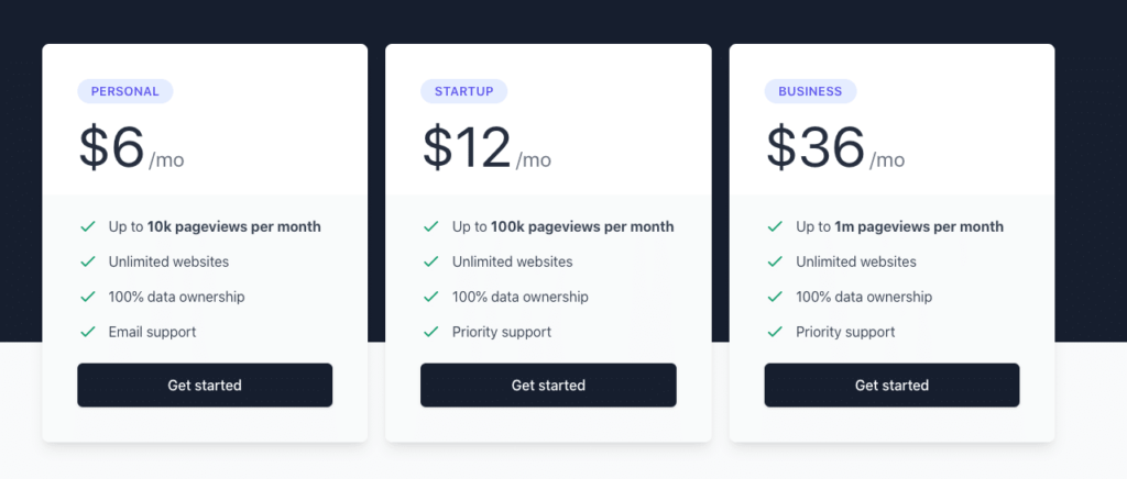Plausible提供三个定价等级:每月6美元的个人计划、每月12美元的启动计划和每月36美元的商业计划。订阅年度计划的人还有33%的额外折扣。
