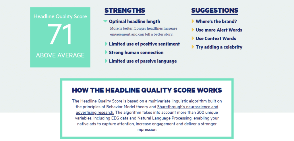 Sharethrough headlines analyzer是一种更复杂的分析器,它不仅可以告诉您如何与其他文案撰写者相比,还可以提供有关如何使您的标题更好的建议。