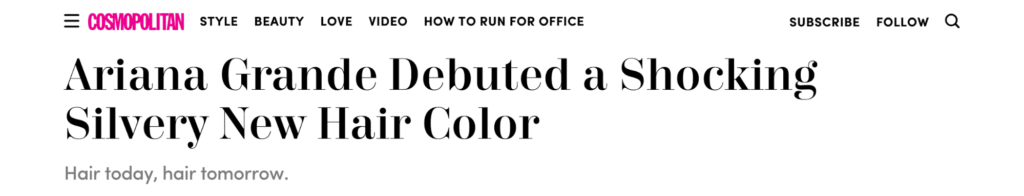 Cosmo本可以使用“Ariana Grande推出银色新发色”。但这真的很有趣吗?好吧,她染了头发,那又怎样?