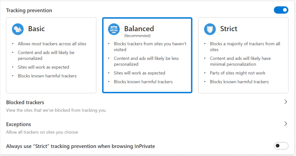 Edge的隐私设置更易于理解和管理。您可以在三个级别的跟踪预防之间进行选择,并查看被阻止的跟踪器列表。