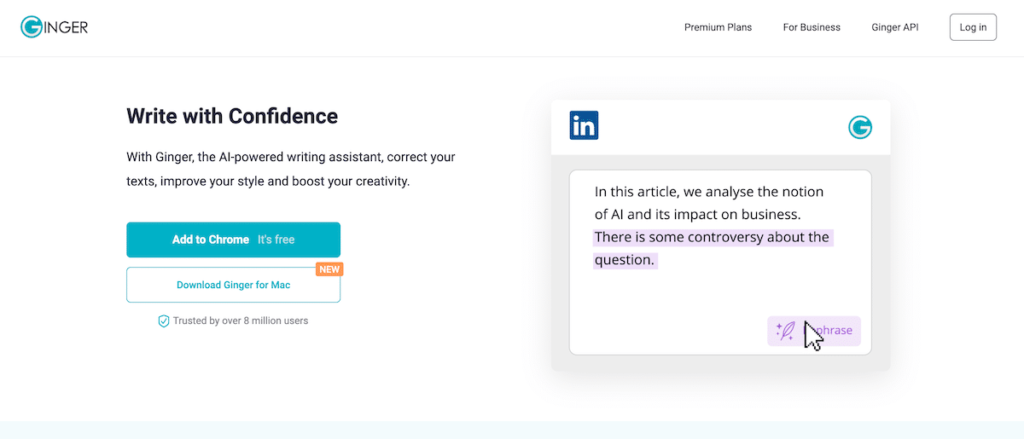 Ginger Software的写作工具提供了许多与Grammarly相同的功能,以及WordTune的改写功能。