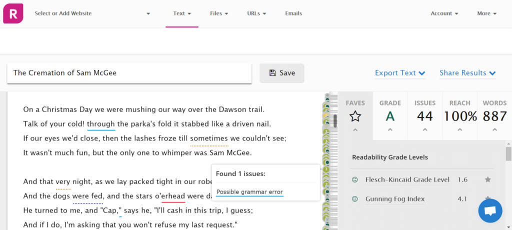 正如您从名称中猜到的那样,Readable使用包括Flesch-Kincaid和Gunning-Fog在内的算法检查您写作的可读性。