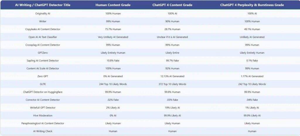 在下面的表格中,你可以看到每个工具对我从头开始写的副本、我从ChatGPT直接取来的、没有修改提示的副本,以及用 “perplexity和burstiness” 提示调整的同一副本的评分:
