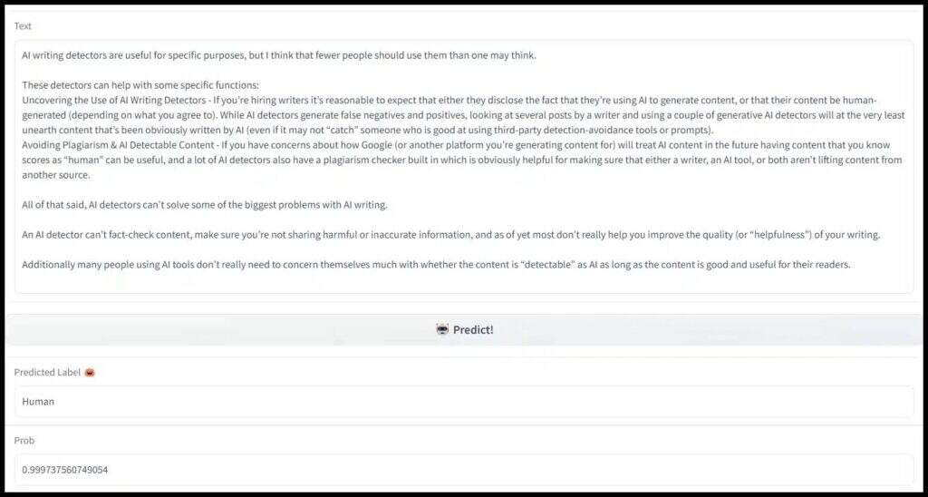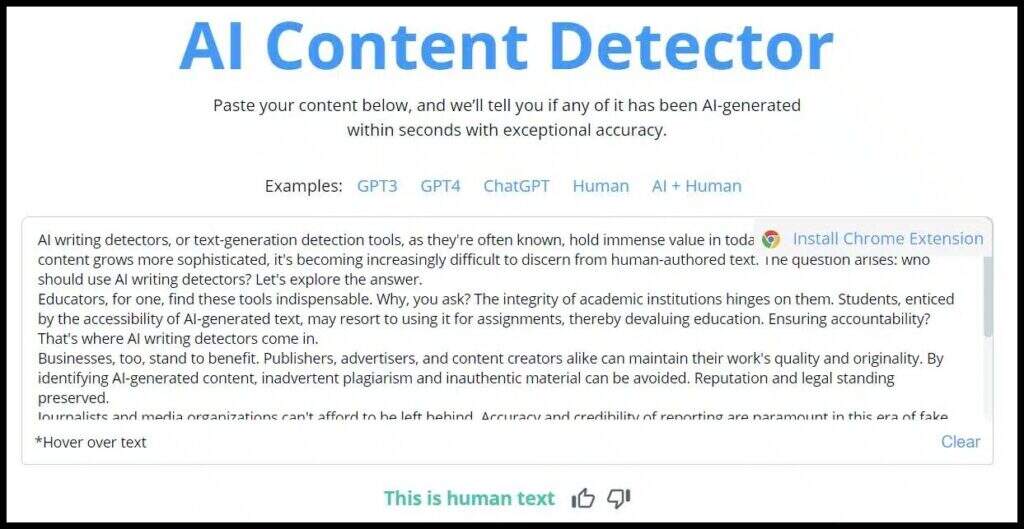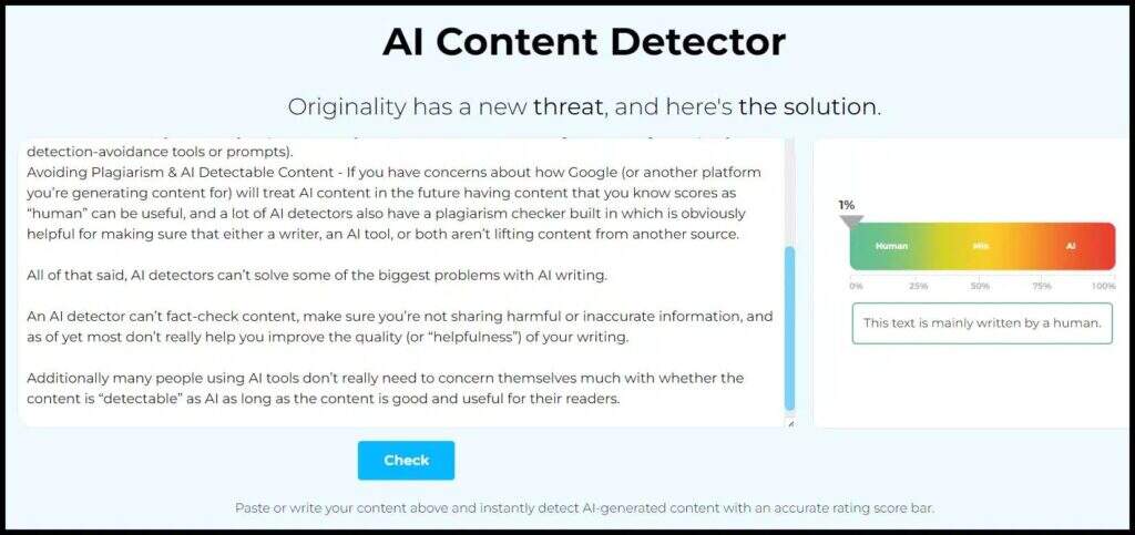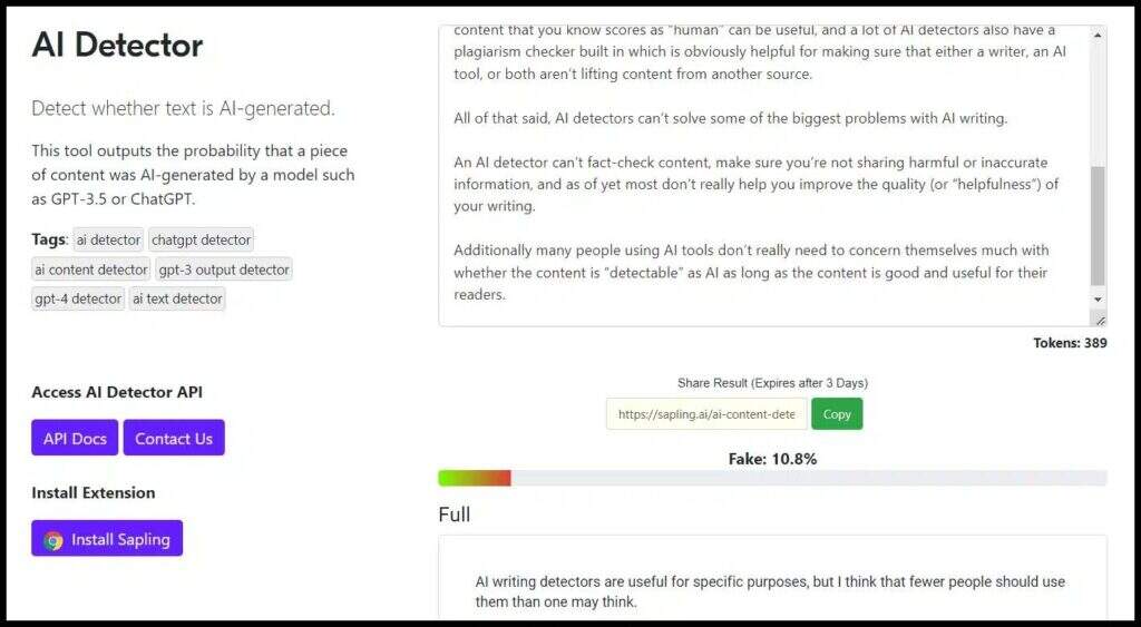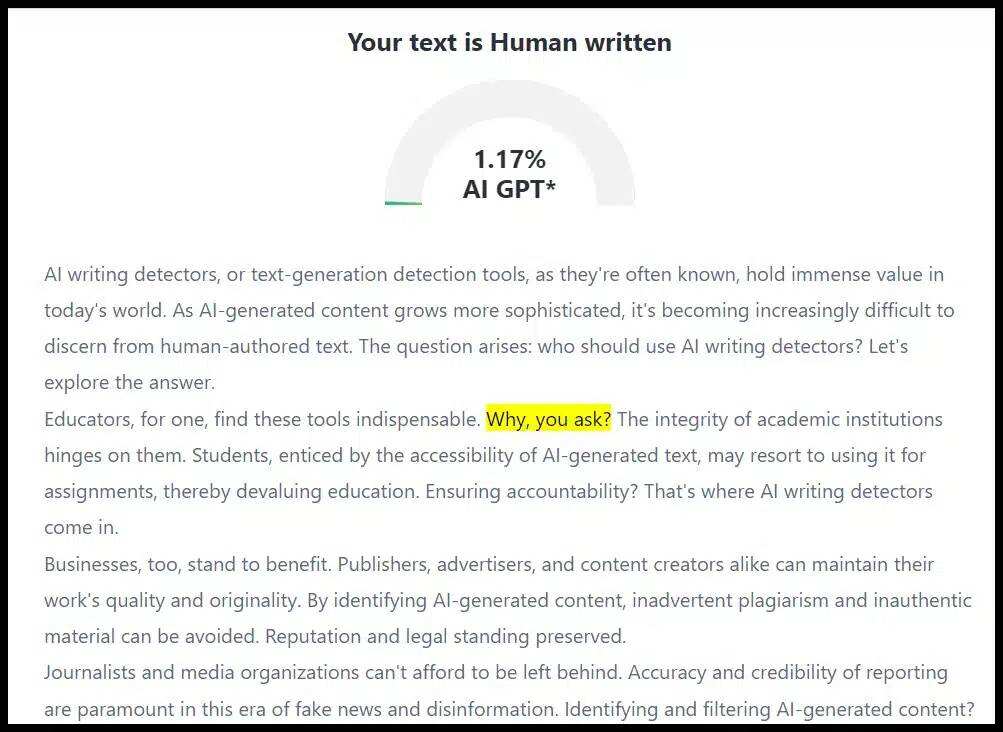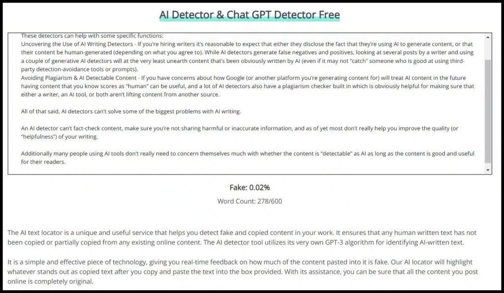 - 惩罚预防:如果你担心人工智能内容在搜索结果中被贬低,这些工具可以帮助你了解人工智能内容有多容易被发现。(当然,谷歌无疑会有不同的工具和检查)。