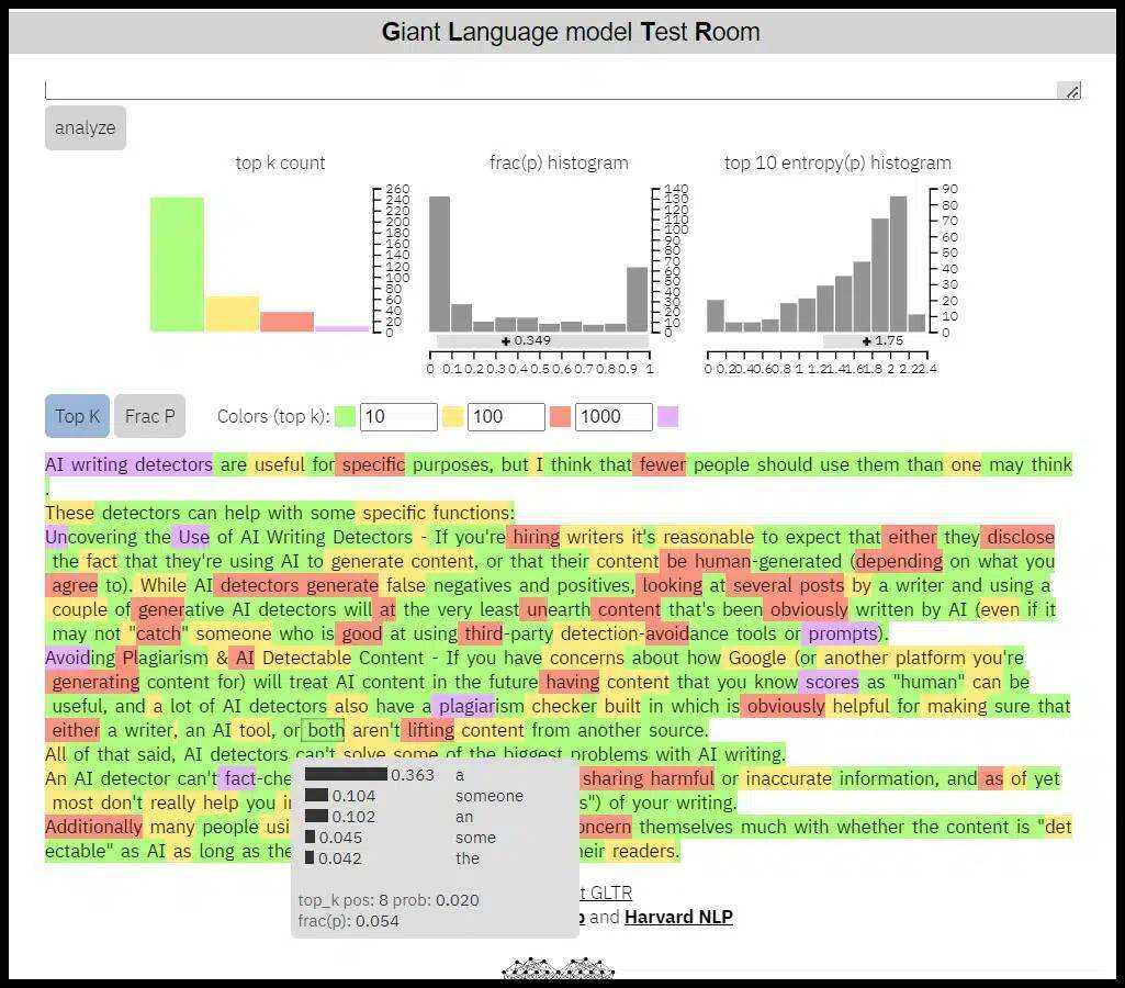 GLTR,即 “巨型语言模型测试室”,是一个免费的工具,是麻省理工学院-IBM Watson人工智能实验室和哈佛大学NLP的Hendrik Strobelt、Sebastian Gehrmann和Alexander Rush的合作作品。