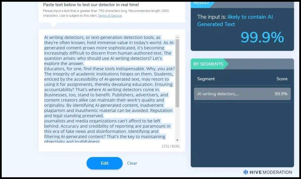 Hive基本上对每个写作样本进行了适当的评分,人类内容的AI可能性为0%,AI样本的评分为99.9%。