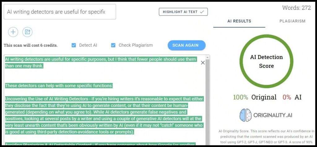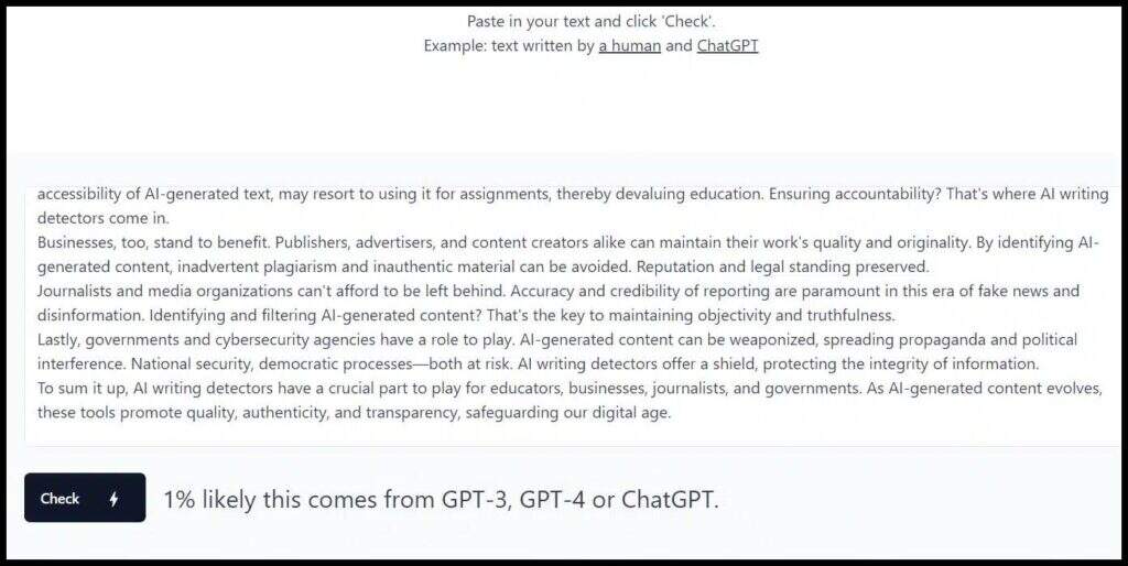 从上图可以看出,这是唯一的人工智能扫描器,具有100%的信心,认为人类的内容是人类的,人工智能的内容是人工智能的(同时也在所有情况下是正确的)。