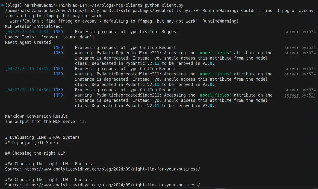 load_mcp_tools 提供了 LangChain 与 Markitdown MCP 交互的函数。然后创建 ReAct 代理,并使用模型和 MCP 工具。代码会为 PDF 创建 file_uri,并发送提示,要求代理使用 MCP 转换文件。