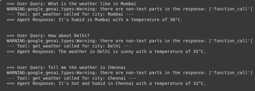 - 当代理使用工具(如 get_weather)时,你会看到类似以下的日志:- 工具:get_weather 已调用… –代理将返回最终响应,甚至可以优雅地处理数据。