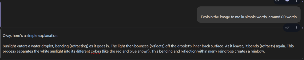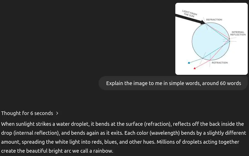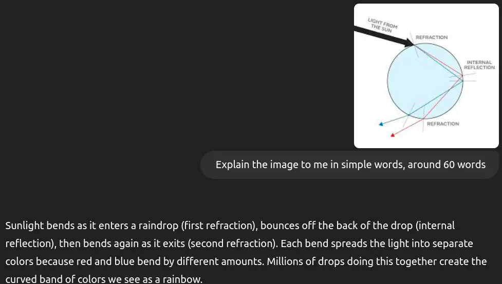 o3 输出在清晰、完整和简洁之间取得了最佳平衡,非常适合普通读者。它清晰地解释了彩虹的形成过程,没有过多的细节让读者不知所措,同时还涵盖了折射、内部反射以及多个水滴如何形成彩虹效果等基本方面。其简洁的风格使其易于消化和理解,是解释彩虹现象最有效的选择。