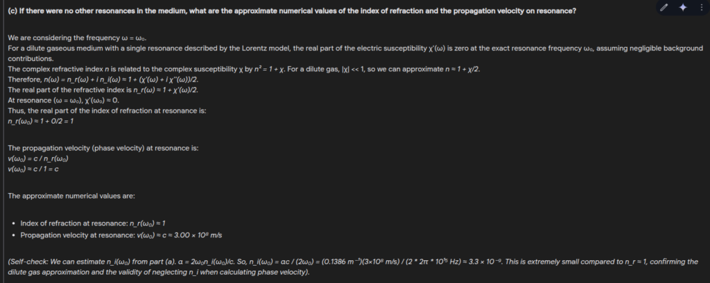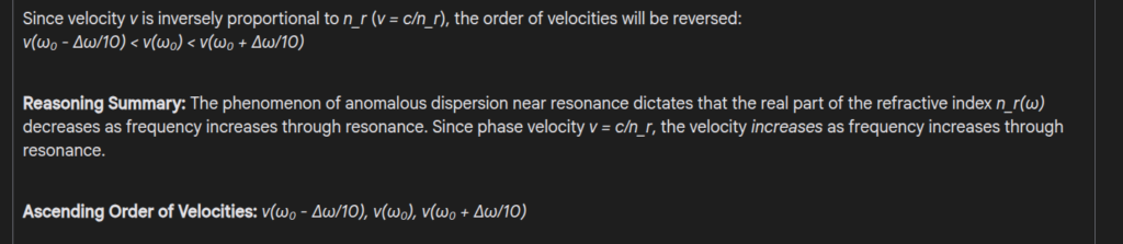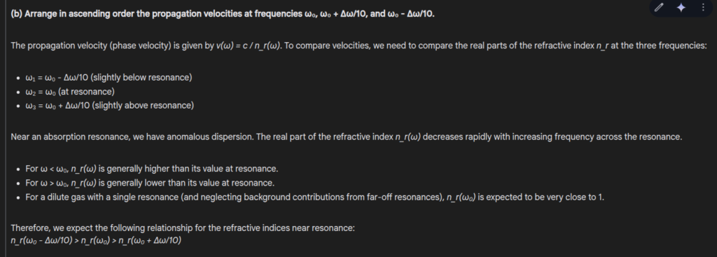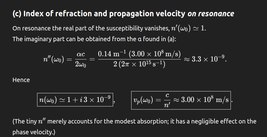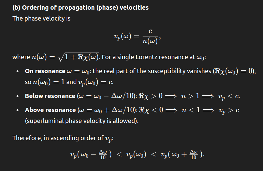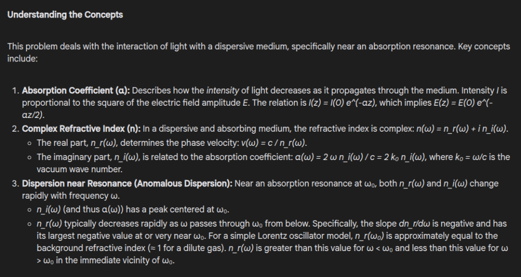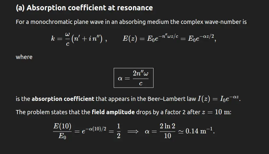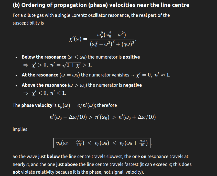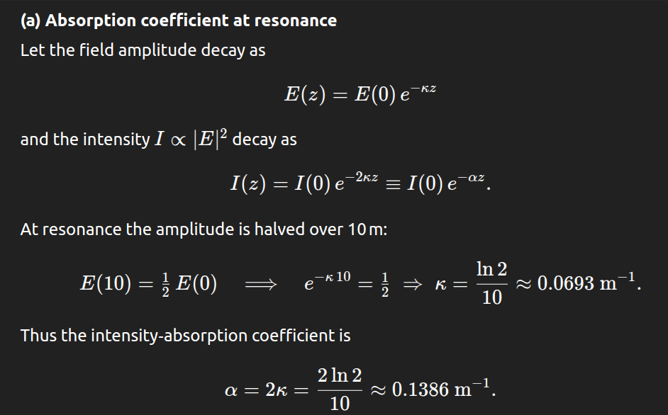 - 共振衰减推理:计算色散气体介质的吸收系数、相位速度排序和共振折射率。