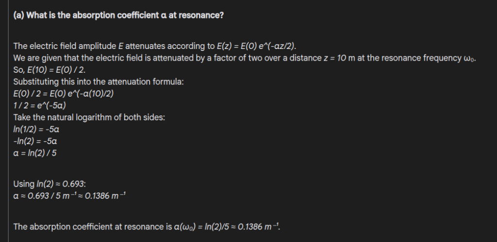 输入提示词:Dispersive Gaseous Medium. A dilute gaseous medium is found to exhibit a single optical resonance at frequency \\( \omega_0 = 2\pi \cdot 10^{15} \\) Hz. The electric field of a plane wave at frequency \\( \omega_0 \\) propagating through this medium is attenuated by a factor of two over a distance of 10 meters. The frequency width of the absorption resonance is \\( \Delta \omega \\). (a) What is the absorption coefficient \\( \alpha \\) at resonance? (b) Arrange in ascending order the propagation velocities at frequencies \\( \omega_0, \omega_0 + \Delta \omega / 10 \\), and \\( \omega_0 – \Delta \omega / 10 \\). Show your reasoning. (c) If there were no other resonances in the medium, what are the approximate numerical values of the index of refraction and the propagation velocity on resonance?