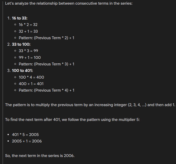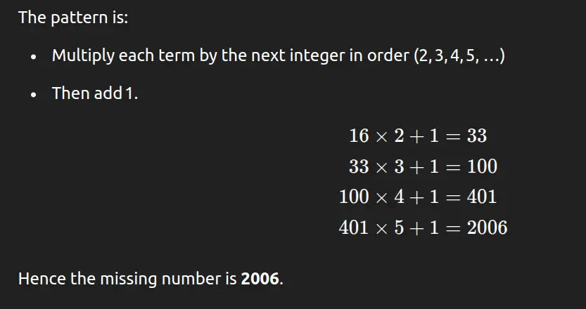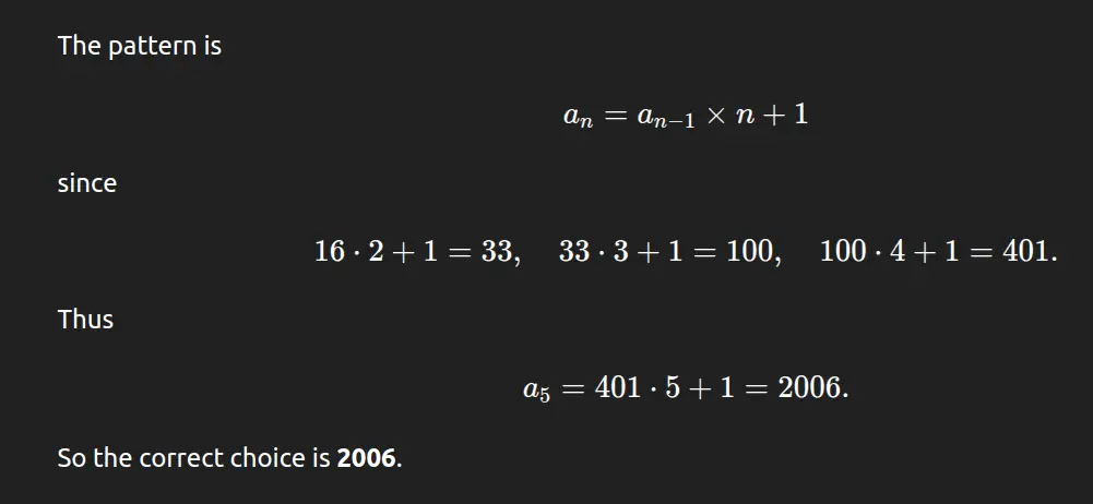 所有三个模型都能正确识别图案并得出正确答案,即 2006 年。Gemini 2.5 提供了详细的分步解释,而 O3 则清楚地解释了逻辑,但 O4-mini 则以其优雅和数学精确性脱颖而出。O4-mini 将序列表达为一个一般公式:an=an-1×n+1a_n = a_{n-1} \times n + 1an=an-1×n+1,以最简洁、最有条理的方式捕捉到了基本模式。因此,它非常适合那些喜欢清晰和紧凑推理的学习者。O4-mini 提供了最佳的整体解释。