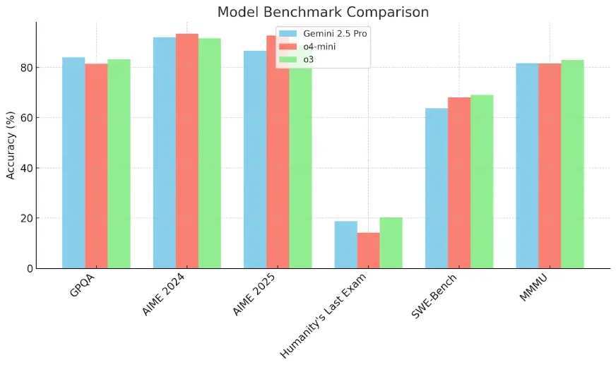 为了更好地了解尖端人工智能模型的性能,让我们通过一系列标准化基准对 Gemini 2.5 Pro、o4-mini 和 o3 进行比较。这些基准评估了模型的各种能力,从高等数学和物理学到软件工程和复杂推理。
