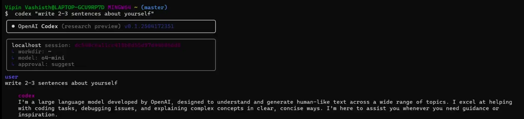 我从一项简单的任务开始,要求 Codex 写出 2-3 句关于我自己的内容。CLI 迅速而准确地做出了反应,在短短几秒钟内就生成了连贯、语法正确的输出。即使输入量极少,它也表现出了很强的提示理解能力和流畅性。
