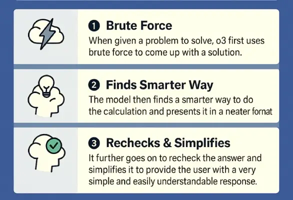当需要解决一个问题时,o3 会首先使用蛮力找出一个解决方案。然后,模型会找到一种更聪明的计算方法,并以更简洁的格式呈现出来。它还会进一步重新检查答案,并将其简化,为用户提供非常简单易懂的回复。