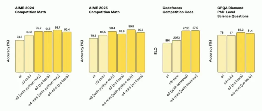 - AIME 2025(数学):o4-mini 在配备 Python 解释器的情况下得分 99.5%,树立了新的标杆,而 o3 紧随其后,得分 98.4%。
