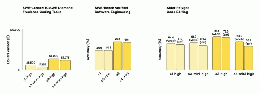 - Aider Polyglot(代码编辑):在代码编辑基准方面,这两个模型都被证明是 OpenAI 的佼佼者,创造了新的记录。