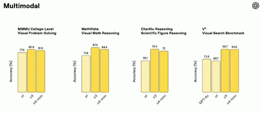 在一系列标准基准测试中,o3 和 o4-mini 模型都表现出了卓越的性能。