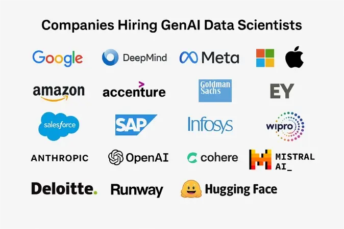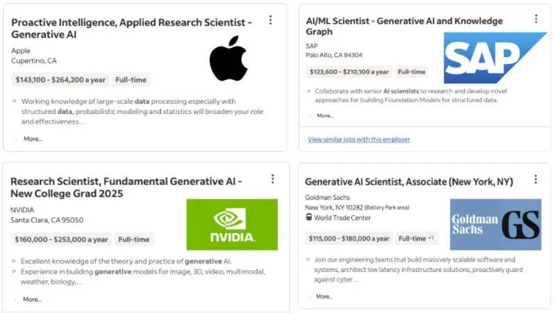 科技巨头、人工智能先行企业和整合 GenAI 解决方案的企业级咨询公司对生成式人工智能数据科学家的需求都很旺盛。正在积极招聘这一职位的公司(截至 2025 年 4 月)包括: