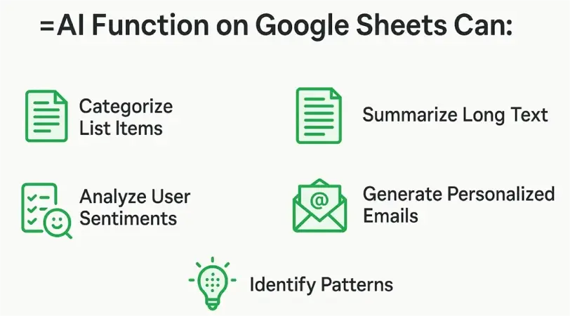 让我们深入了解 =AI 公式的主要功能,它彻底改变了你在 Google Sheets 中处理数据的方式,使任务变得更简单、更高效。