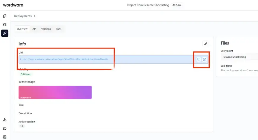 - 单击 Resume Shortlisting,访问已部署代理的详细信息。您可以复制代理的 URL 并将其嵌入您的网站,或者点击复制按钮旁边的方框直接进入您的 WordApp。
