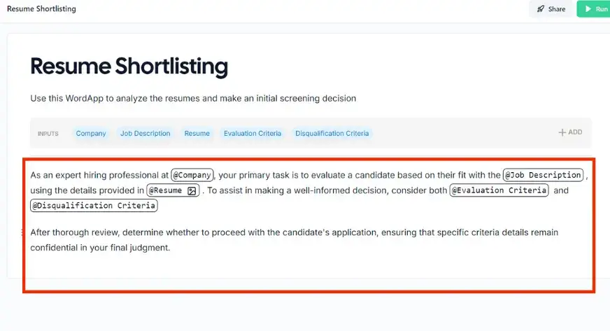 - 说明: 使用此 WordApp 分析简历并做出初步筛选决定。