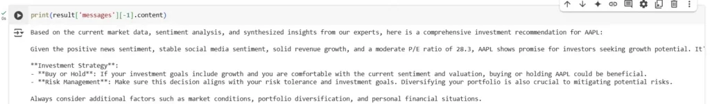 - 投资策略代理(strategy_expert) – 利用所有可用的洞察力生成买入/卖出/持有建议。根据计算出的风险和机会,决定是否将股票标记为买入、卖出或持有。