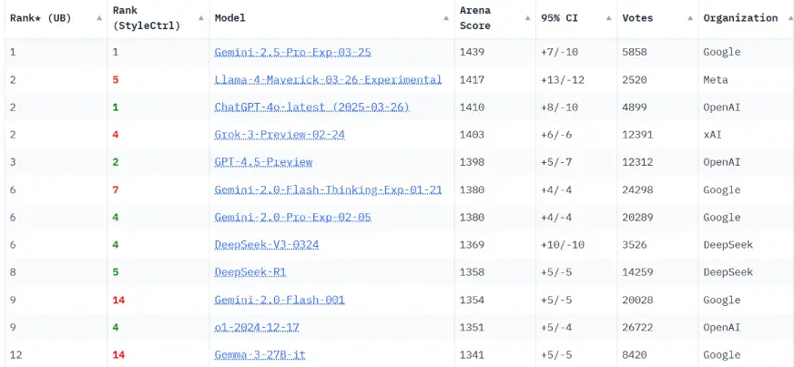 目前得分最高的模型:Gemini 2.5 Pro Exp,得分 1439。
