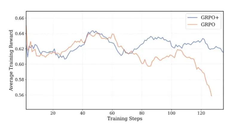 - 消除熵损失:通过消除经常导致训练崩溃的熵损失项,GRPO+ 在整个训练过程中保持了一致的探索。