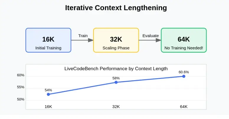 - 先进的训练技术:使用迭代上下文加长技术处理 64K 上下文。利用超长过滤实现 DeepCoder-14B 强化学习。