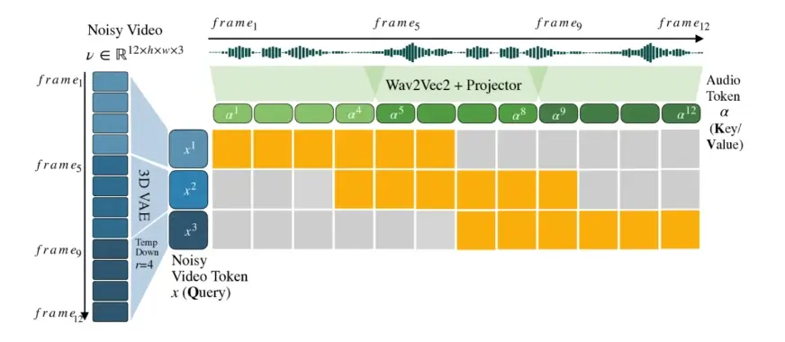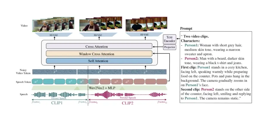 - 扩散变换器(DiT) → 对视频标记进行自我关注,然后与文本和语音输入(按此顺序)进行交叉关注。