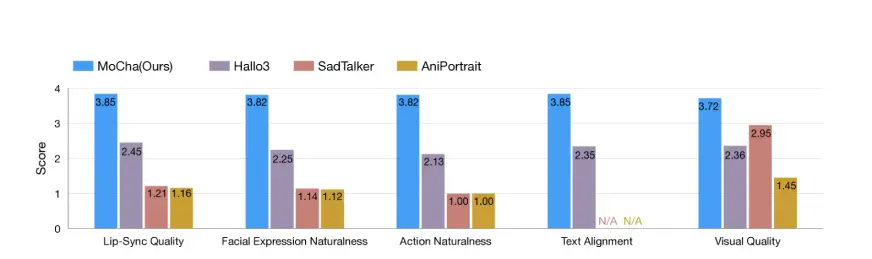 该图显示了 MoCha 和三个基准模型(Hallo3、SadTalker、AniPortrait)在唇部同步、表情、动作、文本对齐和视觉质量五个方面的人类评估得分。MoCha 的得分始终高于 3.7,优于所有基线模型。SadTalker 和 AniPortrait 在动作自然度方面得分最低,这是因为它们只有有限的头部动作。由于不支持文本输入,这两个软件的文本对齐度标记为不适用。总的来说,MoCha 的输出在所有类别中都最接近电影的真实感。