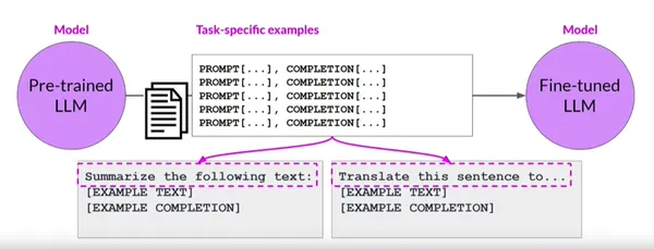 此图表示在特定任务示例中进行微调的过程。这种方法允许开发人员指定所需的输出、鼓励某些行为或更好地控制模型的响应。