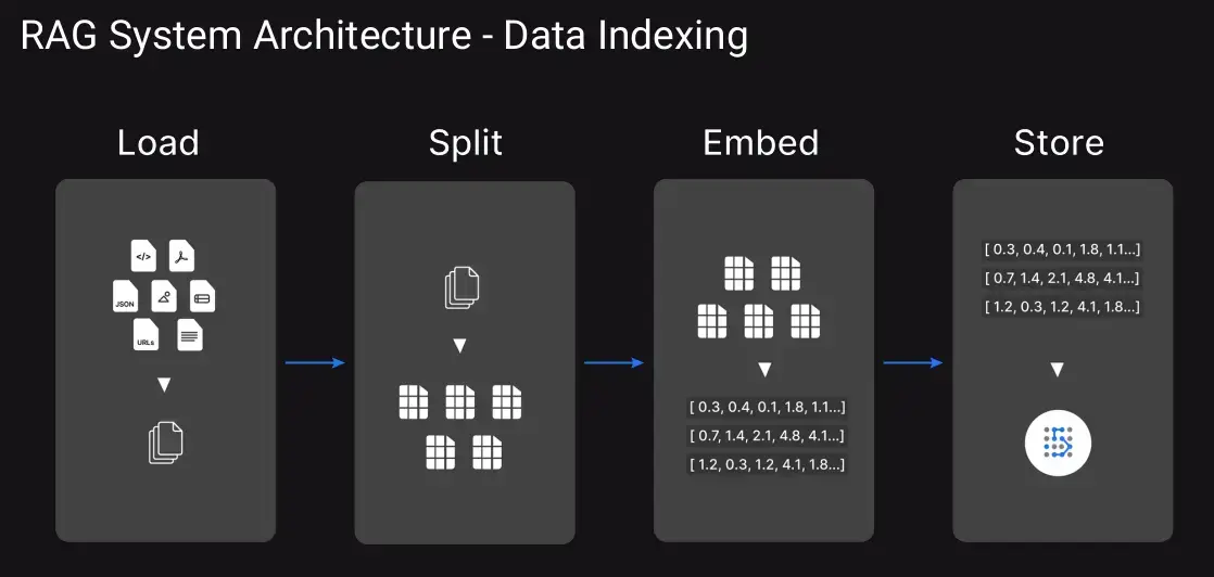 这个 RAG 系统架构显示了矢量存储中块嵌入的基本存储方式。第一步是加载文档,然后使用各种分块技术对文档进行分割或分块,然后使用嵌入模型对文档进行嵌入,以便 LLM 能够轻松理解文档。