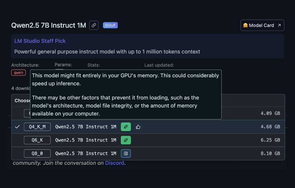 没什么概念?也无所谓,如下图所示,LM Studio 会根据系统资源自动突出显示最合适的模型,您只需选择即可。