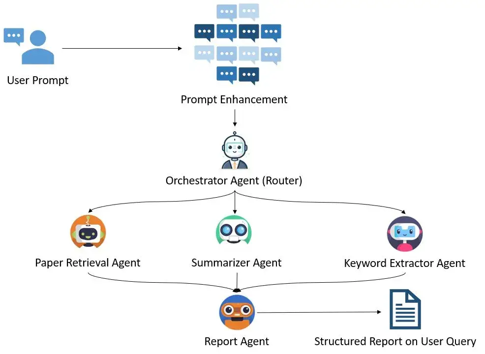 在我们的研究助理系统中,路由器代理(协调者)扮演着这一核心角色。它负责协调各个代理(如提示处理器、论文检索、关键词提取和摘要代理)之间的数据流。这样做可以确保高效处理用户查询、检索相关研究、提取有意义的见解并清晰呈现结果。