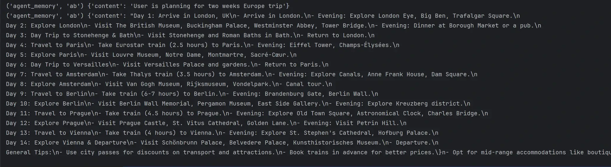 从上面的输出中,我们可以看到它记住了欧洲旅行计划,并在同一计划的基础上推荐了食物选项。如果我们不在这里添加 LangMem,那么如果我们更改 session_id,代理就无法记住该用户的上下文,因为它只有短期记忆。在这里,它将尝试从记忆库中查找语义信息,并增强对该用户的响应。这样,我们就可以利用 LangMem 的长期记忆功能,让代理变得聪明起来。