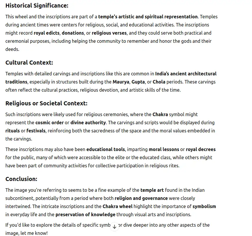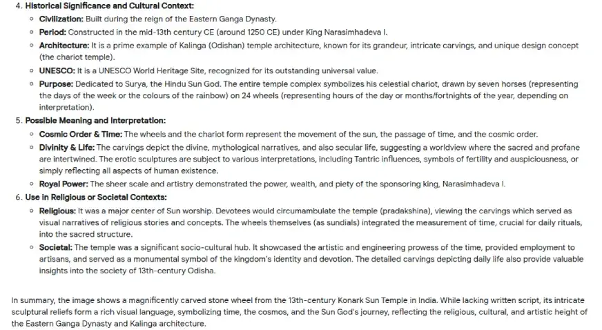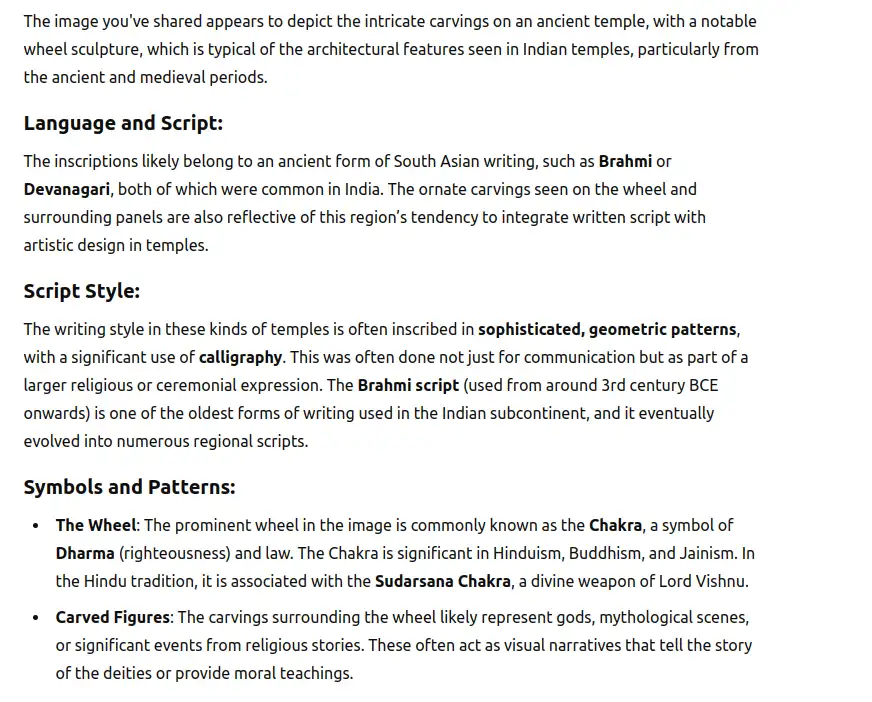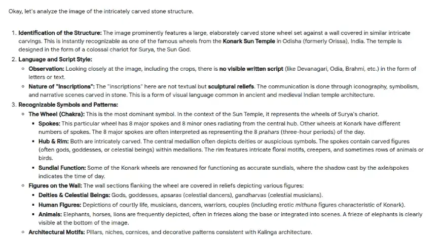 | 识别准确性 | 参照印度的建筑传统,确定该图像是带有达摩轮的古寺碑文。 | 正确识别了科纳克太阳神庙及其作为苏里亚天车的象征意义。 |