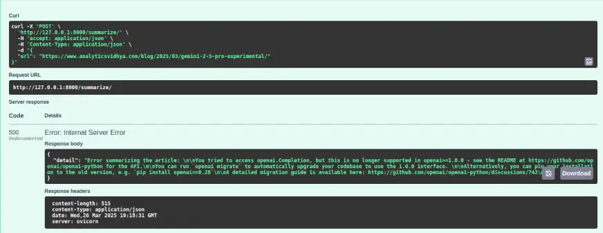 提示词:Write a FastAPI-based news summarization API. The API should accept a news article URL, scrape the article text, summarize it into three bullet points using an LLM, and return the Score as a JSON response. Use BeautifulSoup for web scraping and ensure proper error handling.