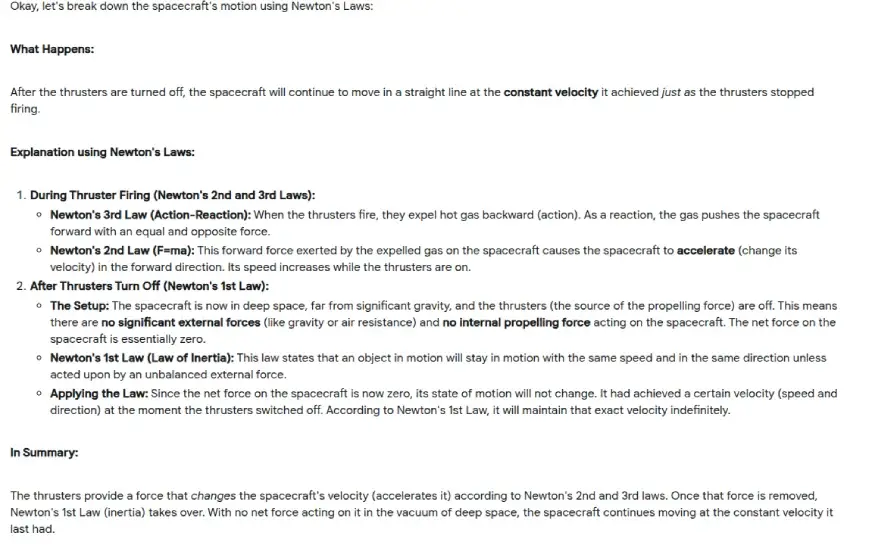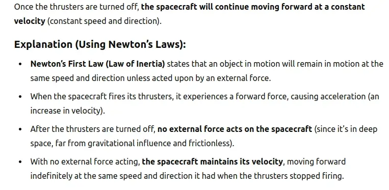 提示词:A spacecraft is moving in deep space, far from any significant gravitational influence. It fires its thrusters in the forward direction for a short period and then turns them off. What will happen to the spacecraft’s motion? Explain your reasoning using Newton’s Laws of Motion.”