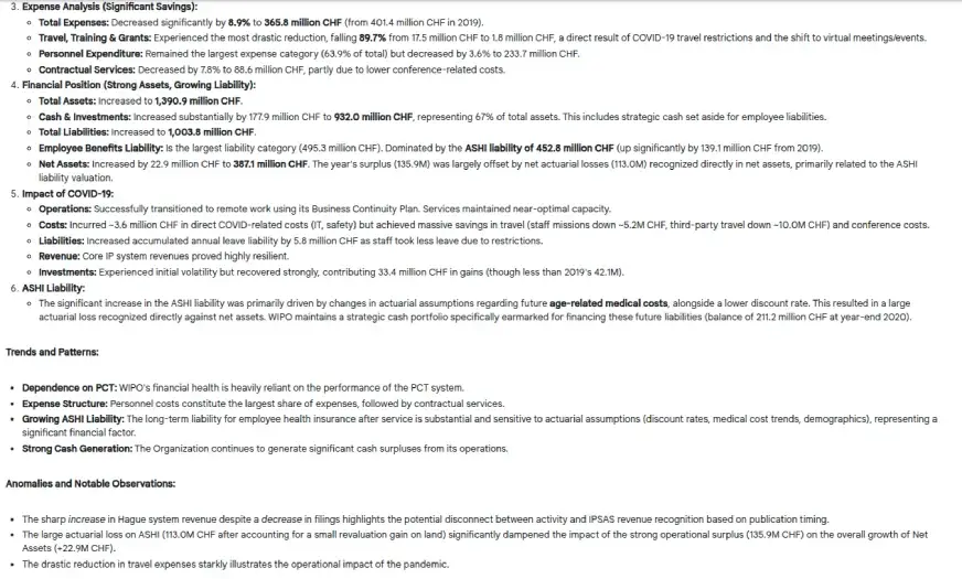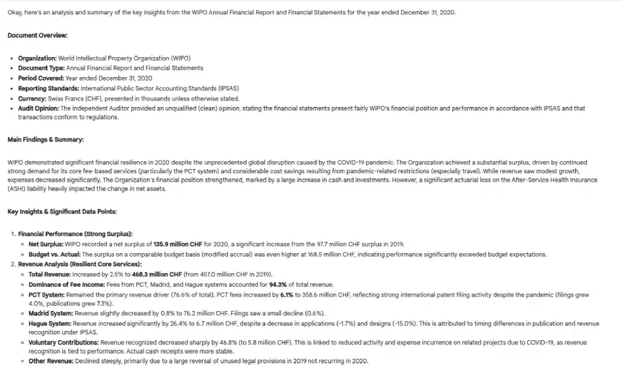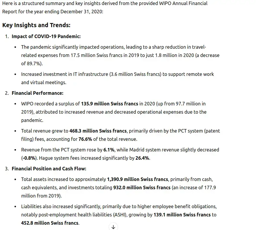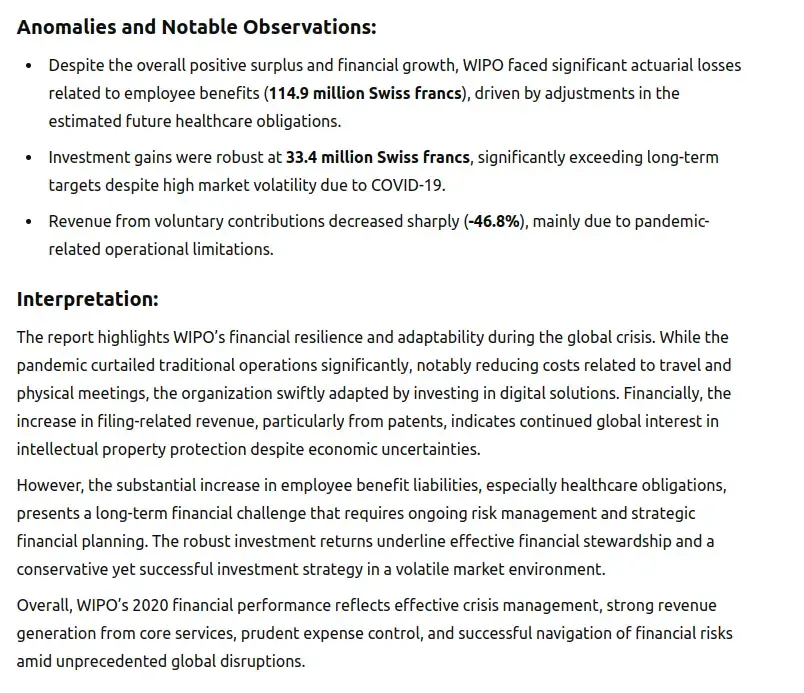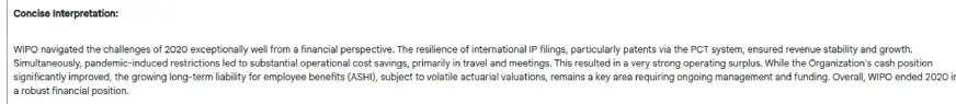 | 简明解释 | 对 WIPO 的财务弹性和挑战进行了有力的解读。 | 在保持清晰的前提下,有效地概括了主要观点。 |