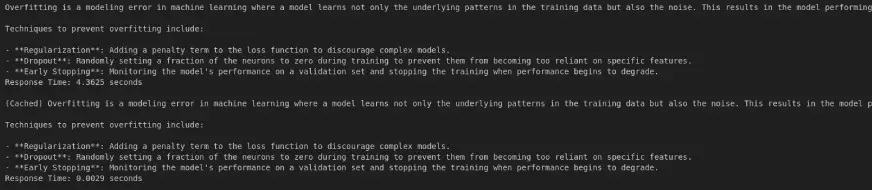 为此,我们首先会问系统:“什么是过拟合?”然后再追问“解释一下过拟合。” 系统首先会检查是否存在缓存响应。如果没有,它就会从知识库中检索最相关的上下文,使用 OpenAI 的应用程序接口生成一个响应,并将其缓存起来。