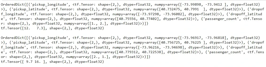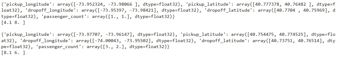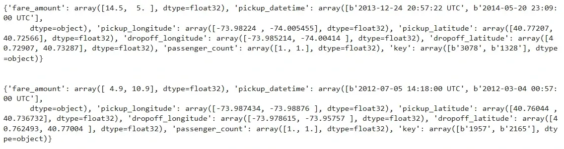 train_ds = build_csv_pipeline('taxi-train.csv', batch_size=2, mode='train')
