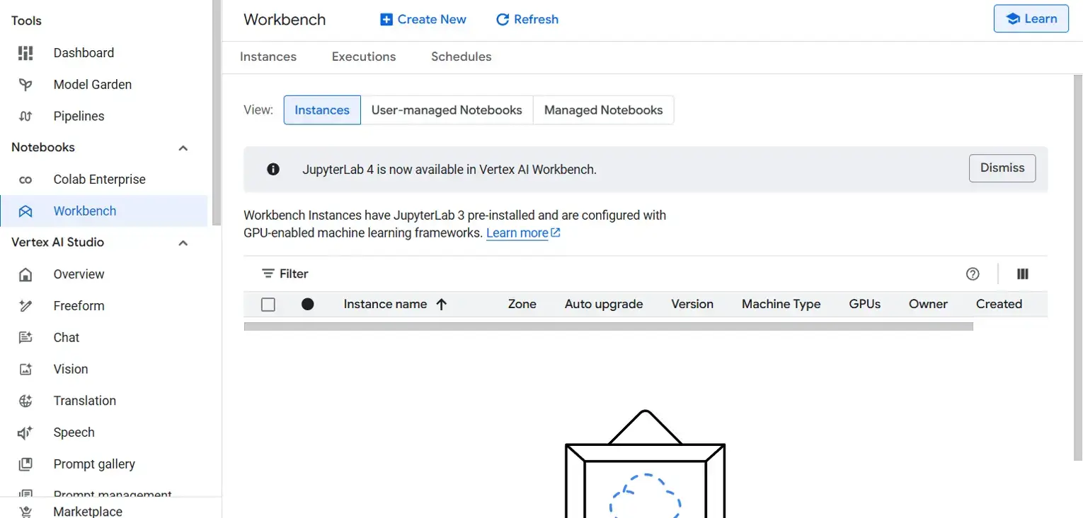 在开始使用 TensorFlow 数据集 API 之前,您需要一个强大的环境。Vertex AI Workbench 是一个很好的选择,因为它提供了一个完全托管、基于云的开发环境,并预装了您需要的所有工具。