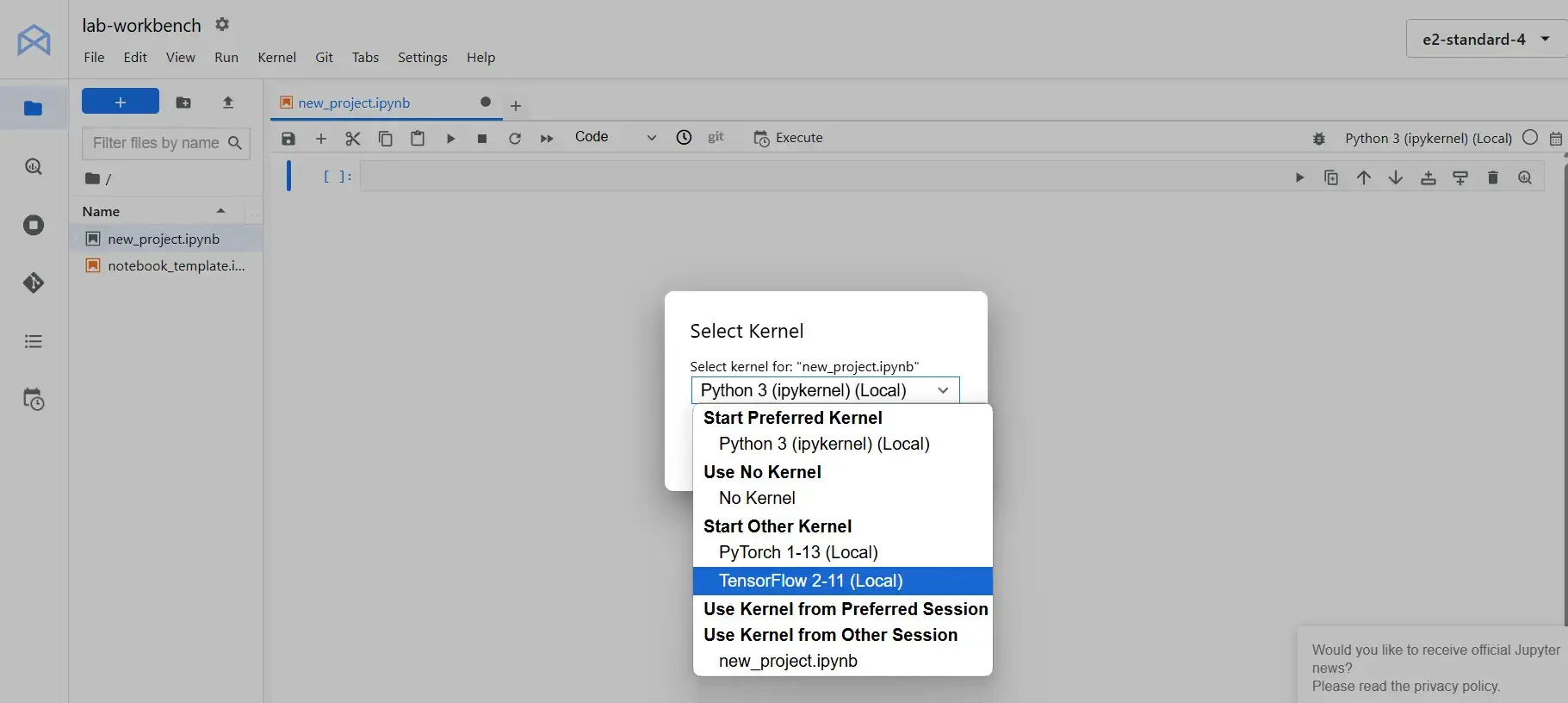 打开 JupyterLab 界面后,点击 Python 3 图标就可以创建一个新的 Python 笔记本。将笔记本重命名为描述性名称是个好主意。为此,右键单击文件名(最初可能是 Untitled.ipynb),然后选择重命名笔记本。选择一个能反映项目的名称,如“new_project”。同时将内核从 python 3 改为 TensorFlow 2-11 (Local)。